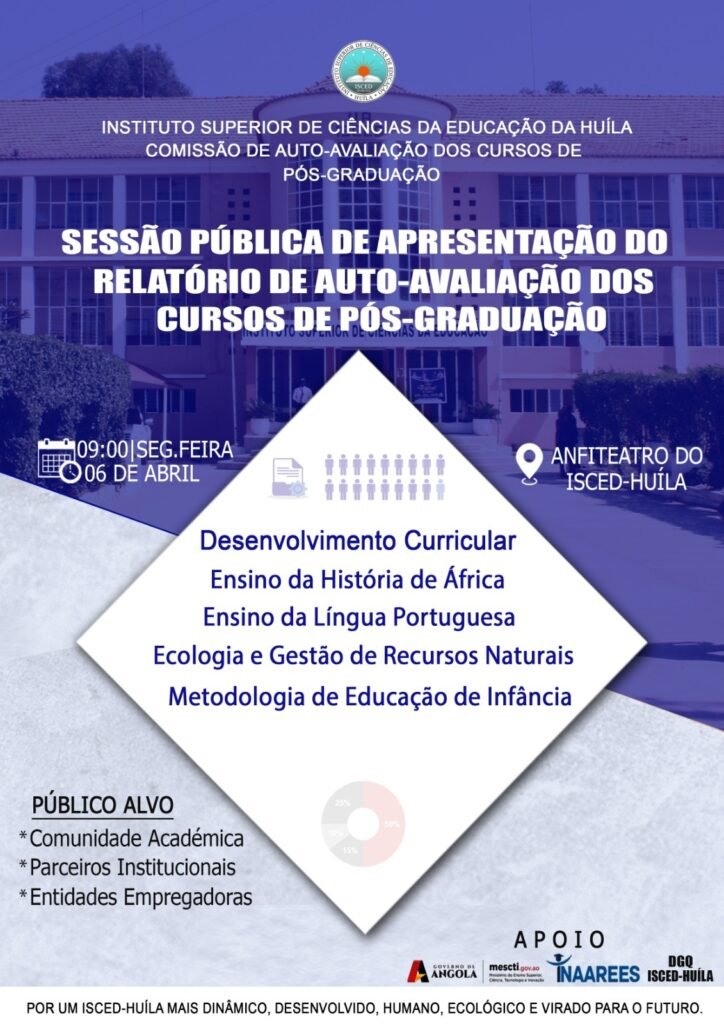 O ISCED-Huíla tem a honra de convidar toda a Comunidade Académica, Parceiros e Entidades Empregadoras do Lubango, a participar na sessão pública de divulgação do relatório de auto-avaliação dos Cursos