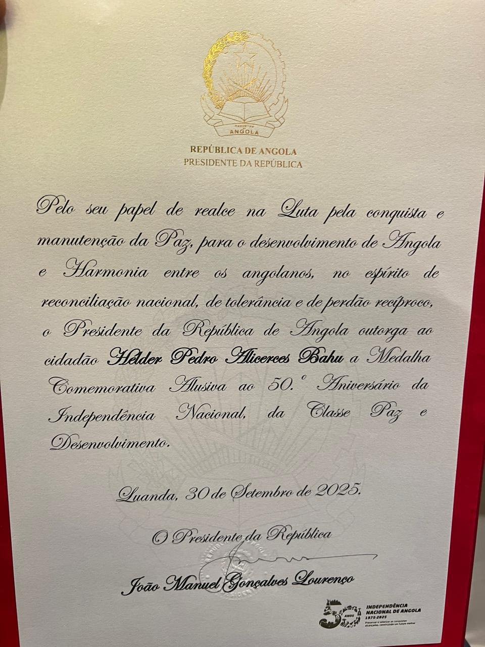 Num dia histórico e carregado de simbolismo, o Presidente da República atribuiu hoje, na 6ª Cerimónia das Condecorações, a Ordem na Classe Paz e Desenvolvimento ao Professor Doutor Helder Pedro Alicerces Bahu, ilustre Presidente do ISCED-Huíla. A homenagem decorre no quadro das festividades dos 50 anos da Independência Nacional, destacando o valor inestimável de personalidades que, com dedicação e visão, têm contribuído para a edificação de uma Angola mais justa, próspera e pacífica.