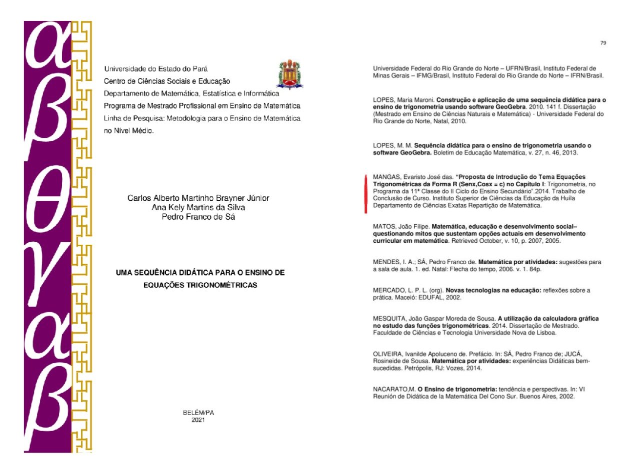 Fruto disso, Monografia do Instituto Superior de Ciências de Educação da Huila (ISCED-HUILA) foi citada no Brasil, na Universidade do Estado do Pará, em Dissertação apresentada ao Programa de Mestrado Profissional em Ensino de Matemática, Linha de Pesquisa “Metodologia para o Ensino de Matemática no Nível Médio”. A dissertação tem como título: UMA SEQUÊNCIA DIDÁTICA PARA O ENSINO DE EQUAÇÕES TRIGONOMÉTRICAS. A mesma é da autoria de Carlos Alberto Martinho Brayner Júnior e encontra-se no repositório da educapes, que é um portal brasileiro de objetos educacionais abertos a alunos e professores da educação básica, superior e pós-graduação que busquem aprimorar os seus conhecimentos, como se pode consultar em (https://educapes.capes.gov.br/handle/capes/603968?mode=full).