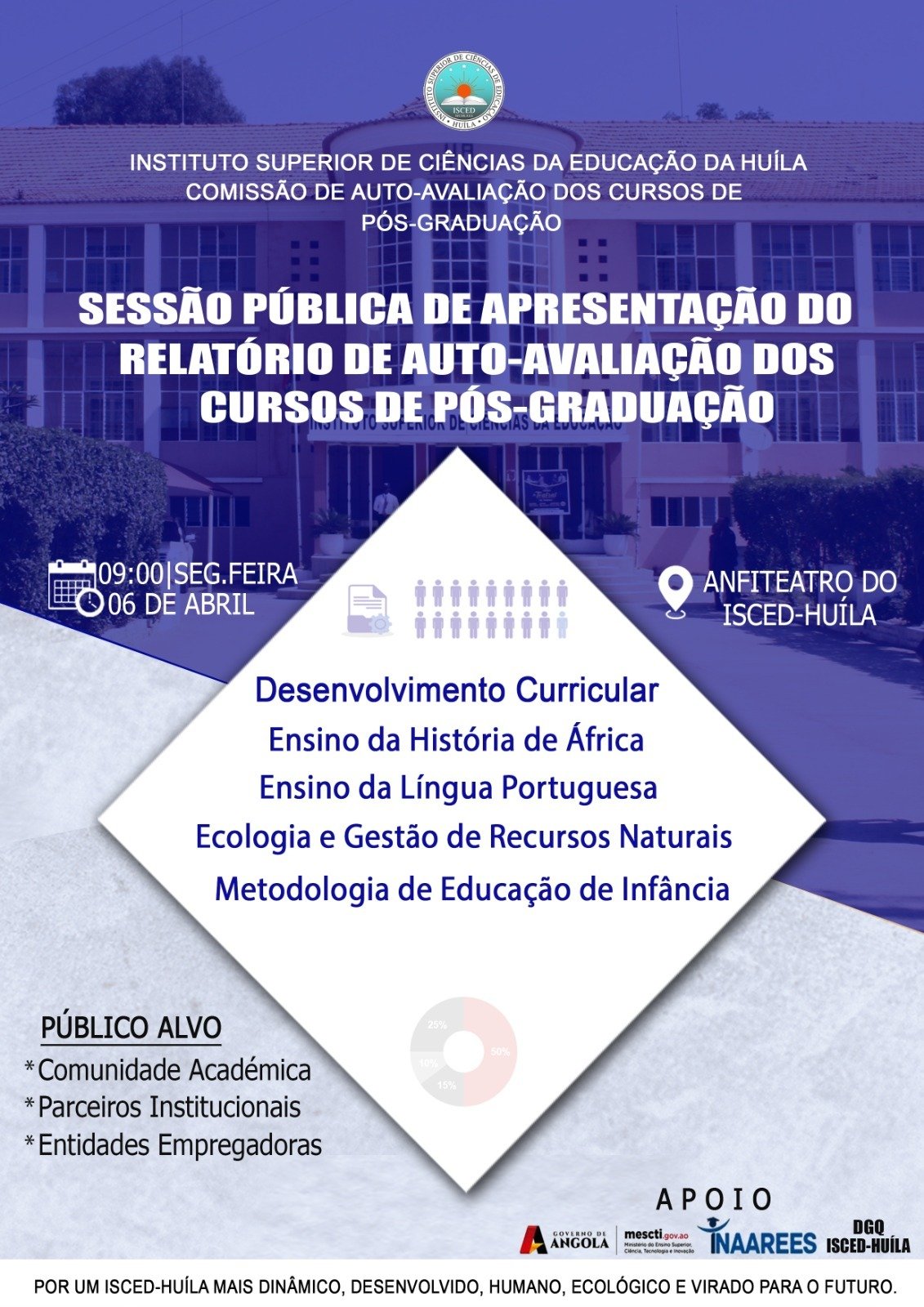 O ISCED-Huíla tem a honra de convidar toda a Comunidade Académica, Parceiros e Entidades Empregadoras do Lubango, a participar na sessão pública de divulgação do relatório de auto-avaliação dos Cursos de Mestrado em Desenvolvimento Curricular, Metodologia de Educação de Infância, Ensino da História da África, Ensino da Língua Portuguesa e Ecologia e Gestão de Recursos Naturais, ministrados no ISCED-Huíla.